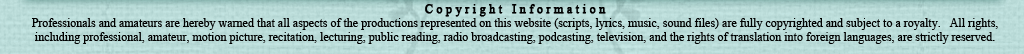 SCRIPT EXCERPT Click here to read excerpts from the play Free Perusal Scripts are currently available in PDF formatt. To receive a script, please fill out the Perusal Request Form THE MUSIC The music for the play-within-a-play is given to all producers as part of the production contract. This includes a demo CD with vocalists which may be distributed to your actors to assist them in learning the songs, and a Show CD with the accompaniment played on an old-sounding piano.